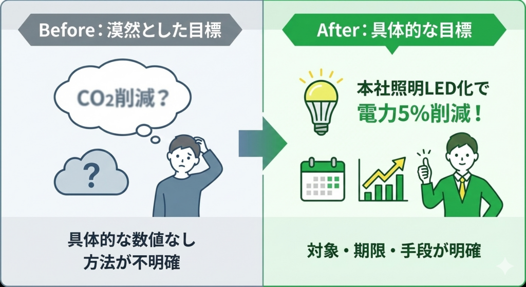 たとえば、「CO2排出量を削減する」という漠然とした目標ではなく、